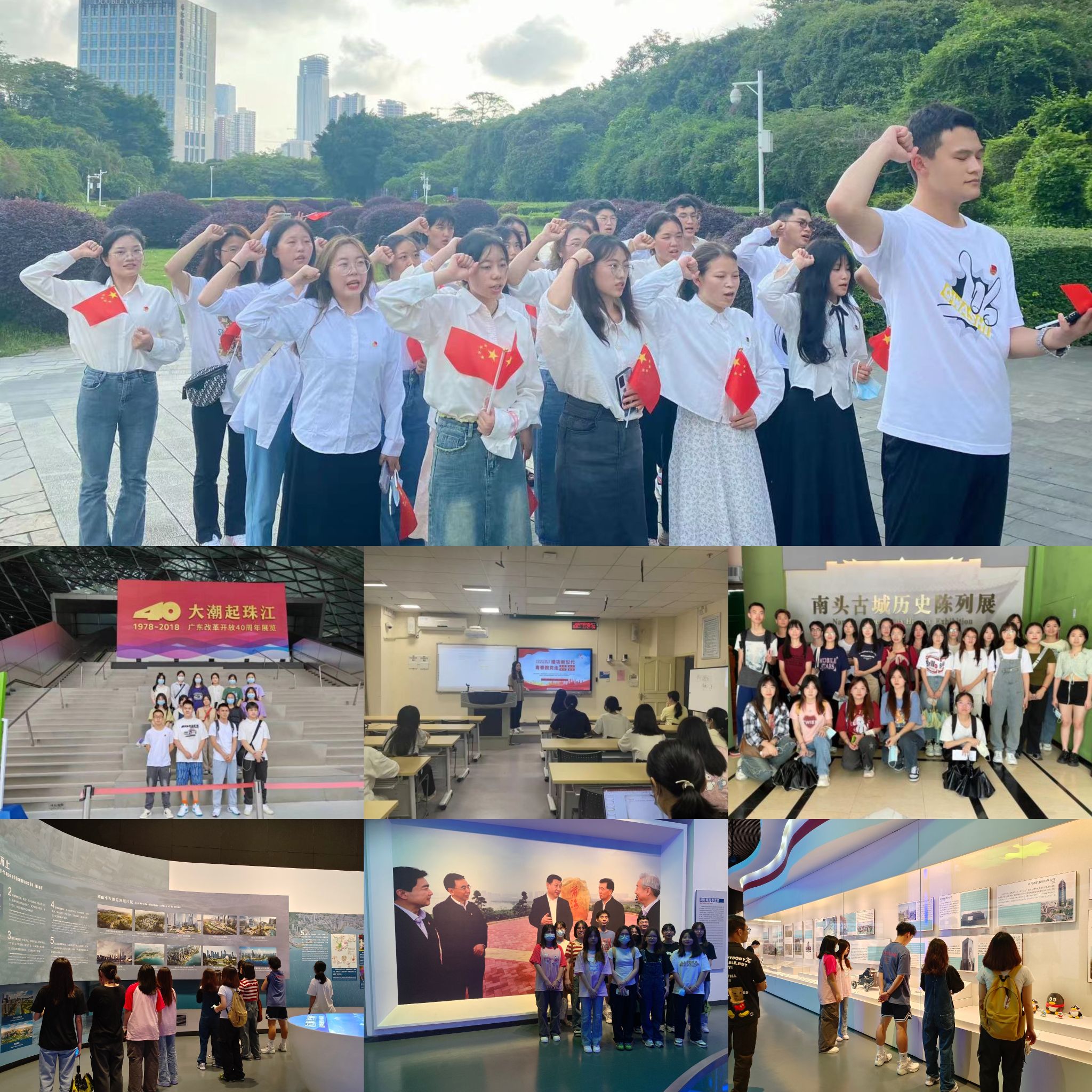 其中,22药生2班团支部组织全体全员参观华强北博物馆,深入探索“深圳改革开放精神”。团员聆听博物馆相关工作人员对展馆的介绍,了解深圳改革开放、中国电子行业发展过程以及华强北创业者荡气回肠的奋斗故事。22营养2班团支部前往深圳南山博物馆开展红色经典诵读会,引导团员青年重温红色经典、感悟革命精神,不断提升思想理论水平。21药学3班团支部前往南头古城博物馆参观实践,深刻体会深圳的城市发展史、抗击外敌侵略史。21食检(华强)团支部参观深圳改革开放博物馆,观看“大潮起珠江——广东改革开放40周年”展览,直观感受在党中央领导下广东改革开放40年的壮阔历程和辉煌成就,深刻领悟到了广东坚持改革不停顿、开放不止步,奋力实现“四个走在全国前列”、当好“两个重要窗口”的生动实践。此外,21药学(博伦)团支部带领团员青年参观学习深圳市海普瑞药业集团股份有限公司,感受专业教育和劳动实践教育的有机融合,更加清楚明白学习、劳动与实践的重要性,并带队参观中山公园,纪念革命先辈。团员们戴着尊严的团徽,拿着鲜红的国旗,合唱团歌,重温入团誓词,在铿锵有力的誓言中坚定不忘初心、牢记使命的信念。