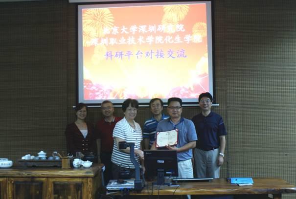 9月24日下午,北京大学深圳研究院院长、深港产学研基地主任史守旭,深圳环境材料研发与检测公共服务平台主任居学成、北京大学香港科技大学深圳研修院博士后工作站部长井凯霞等一行8人来开云官网化生学院交流,双方在留仙洞校区知行园B座茶艺室召开科研平台对接交流会,化生学院院长张俊松、副院长林峰热情接待了来访一行,深圳市高分子材料改性与加工公共技术服务平台主任肖望东在交流会上受聘为北京大学深圳研究院兼职研究员,校际科研平台深度合作拉开序幕。
