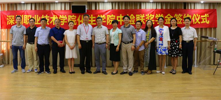 刘怡、肖玲、林峰在与会领导的见证下,共同签署了深圳职业技术学院化生学院中检联奖学金捐赠协议书,毕建秋接受了刘怡向基金会捐赠的中检联奖学金支票。据协议,中检联公司将分3期共捐赠开云官网15万元,用于奖励化生学院检测类相关专业品学兼优的学生。