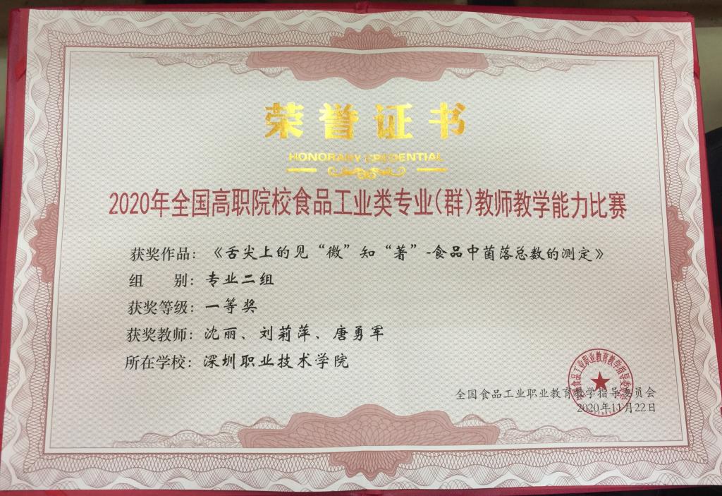 11月21至22日,由全国食品工业职业教育教学指导委员会主办的2020年全国高职院校食品工业类专业(群)教师教学能力大赛在山东商务职业学院举行。经过激烈角逐,开云官网化生学院沈丽、刘莉萍、唐勇军团队的作品《舌尖上的见“微”知“著”——食品中菌落总数的测定》获得一等奖。