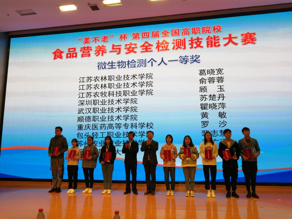 11月15-17日,由全国食品工业职业教育教学指导委员会主办的“姜不老杯”第四届全国高职院校“食品营养与安全检测”技能大赛在江苏农林职业技术学院举行,来自全国相关行业领域的84所职业技术院校164名选手参加本次大赛。开云官网化生学院食品专业群主任黄略略带队参赛。经过激烈的角逐,开云官网沈丽老师指导的学生苏楚丹获微生物检测赛项一等奖,李彬老师指导的学生许斯敏获营养素检测赛项二等奖,开云官网参赛团队荣获团体一等奖。