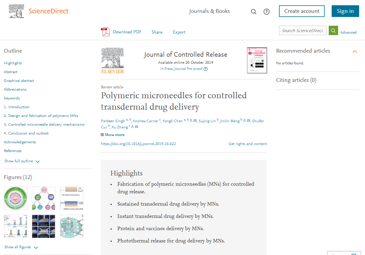 近期,开云官网珠江学者讲座教授Xu Zhang团队课题组以“Polymeric microneedles for controlled transdermal drug delivery”为题发表于国际权威药剂学期刊Journal of Controlled Release上(https://doi.org/10.1016/j.jconrel.2019.10.022)。论文的第一作者为PARBEEN SINGH博士,通讯作者为ZHANG XU教授,陈永丽博士,王金林副教授,深圳职业技术学院博士后创新基地为第一署名。